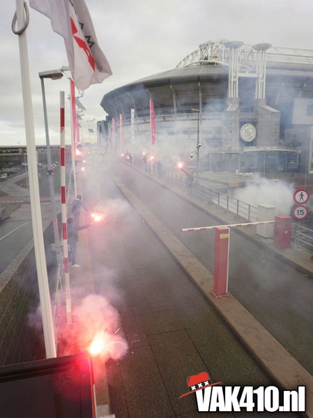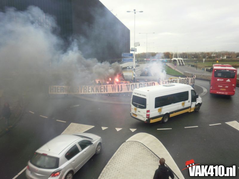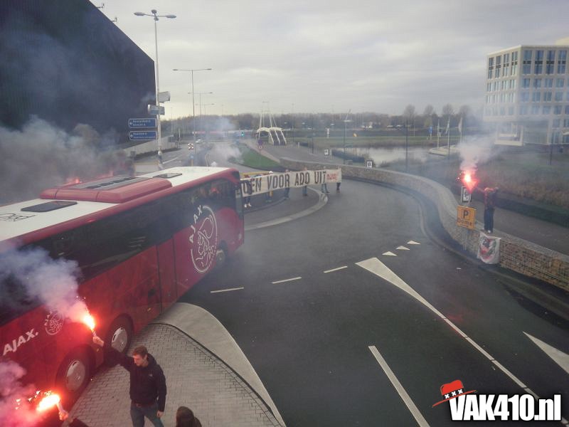 In Amsterdam word er van alles aan gedaan om supporters van Ajax en Den Haag weer de onderlinge wedstrijden te laten bezoeken. Den Haag is dan ook gewoon welkom in de Arena, maar in de hofstad vinden ze het kennelijk allemaal wel prima zo. En daar kunnen wij niet bij met ons hoofd! Uitsupporters voegen aan een wedstrijd beleving toe. Een beetje onderlinge rivaliteit maakt de spanning nog een stuk groter! Wij willen niets liever dan eindelijk weer eens naar Ado te mogen reizen! Vanmorgen werd door VAK410 met een groep van 50 verzameld bij de fly-over van de Arena. Bij het passeren van de spelersbus werd er vuurwerk ontstoken en de spelers werden toegezongen. De enige manier om hen vandaag te supporten. Maar alleen dit jaar nog op deze manier, want voor volgend seizoen zullen wij er voor zorgen dat we hoe dan ook in Den Haag staan! Daarvoor zullen we echt alles uit de kast trekken! Geef ons ADO uit terug! Na het ondersteunen van de spelers werd er koers gezet richting de stad, waar we in de kroeg zagen dat Ajax met liefst 4-0 won.