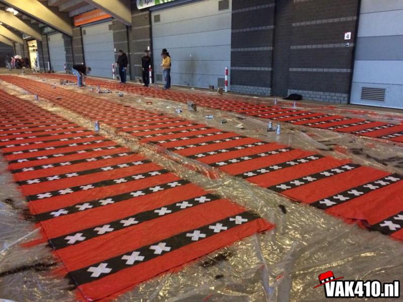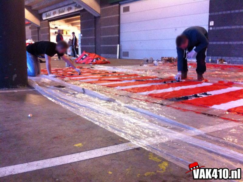Op het vak vindt een ieder een Amsterdams doekje op zijn stoel. Weken lang werd er door diverse jongens voorbereid en gebouwd aan 1600 Amsterdamse vlaggen. Na diverse songs, die meteen goed hard gaan , betreden de spelers het veld voor de wedstrijd. Het gehele vak wordt volledig gekleurd door de Amsterdamse doeken en megavlaggen wat zorgt voor een fantastisch gezicht.