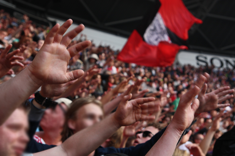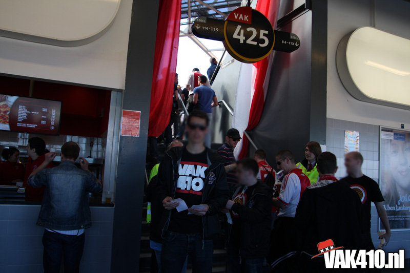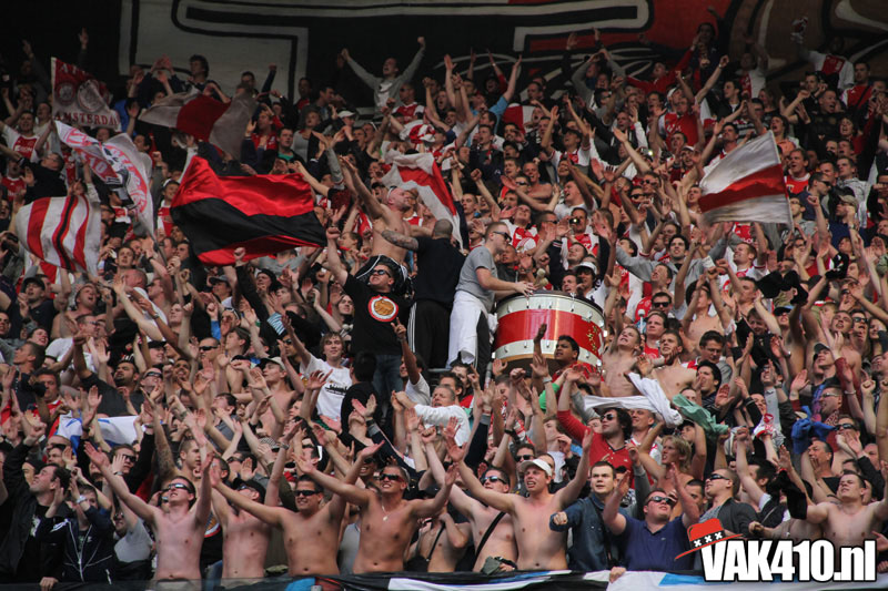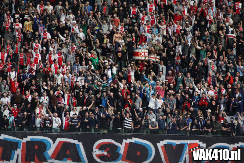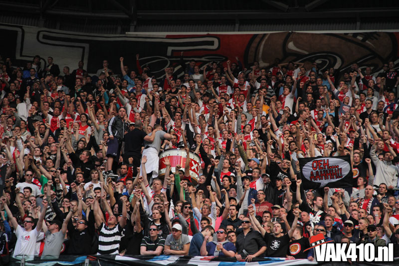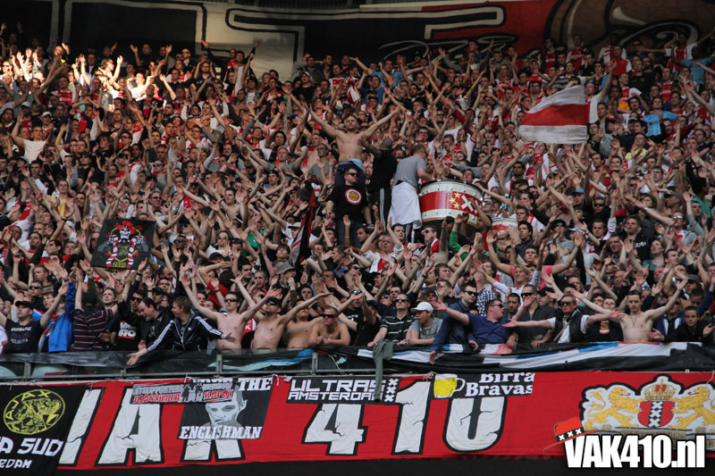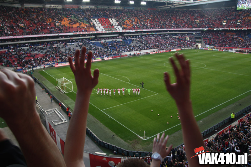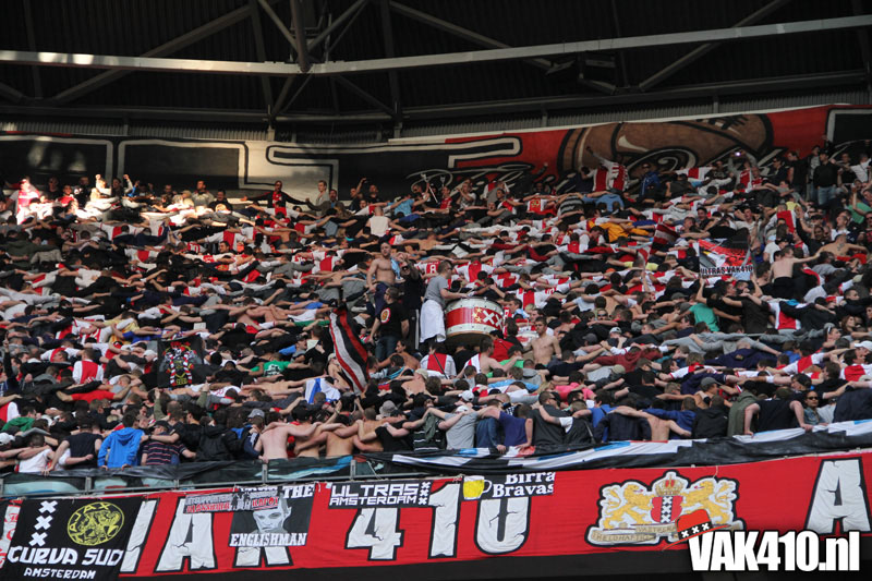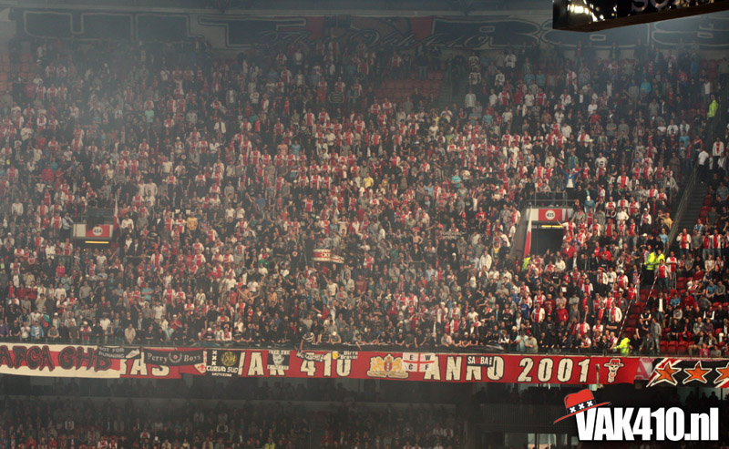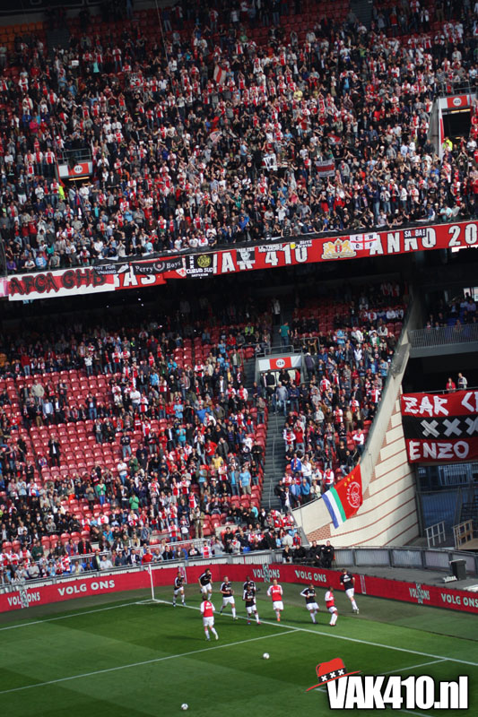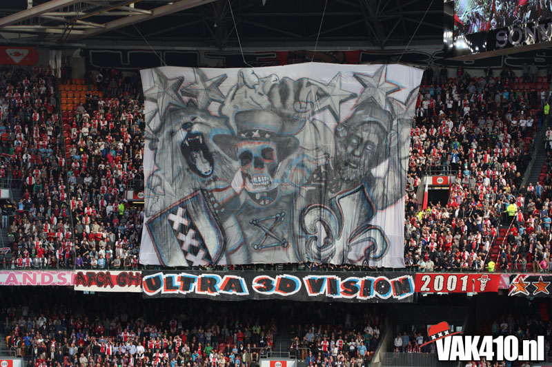 Op 410 stond vandaag een wereld primeur op het menu: ULTRA 3D VISION. Voordat het doek werd gehesen werden op het vak honderden zwarte zonnebrillen ingeruild voor 3d brilletjes. De wereld waarin wij leven is nou eenmaal driedimensionaal. Op het doek kwamen de leeuw, Ajax en 410 tot leven. Nee, ze kwamen eruit.