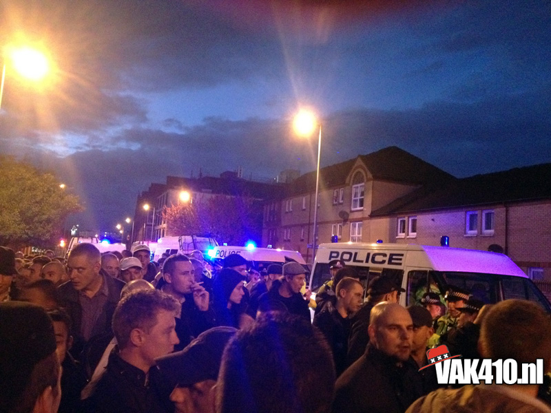 Op de wedstrijddag werd het centrum van Glasgow overgenomen door de vele Ajax supporters en in verschillende kroegen werd er verzameld. De als fanatiek bekend staande Celtic supporters waren niet tot nauwelijks te zien overdag. Later op de middag stegen de baromzetten verder en vormde zich een grote groep voor één van de kroegen. In deze formatie werd er te voet pas gezet richting Celtic Park. Alle toeters en bellen gingen direct af bij de Schotse smeris en na een kat en muis spel werd na ongeveer een half uur de groep ingesloten en onder zware politie begeleiding richting het stadion geëscorteerd. Tot onze verbazing bleek er vooraan deze escorte een grote afvaardiging van de Amsterdamse voetbaleenheid aanwezig. Waar in Amsterdam de zakkenrollerij hoogtij viert en de crisis van dal naar dal gaat worden deze heren keer op keer doodleuk op een snoepreisje gestuurd. In een slakkentempo kwamen we een klein half uur voor de wedstrijd dan eindelijk aan op het beruchte Celtic Park. De verhalen die over dit stadion de rondte gaan zijn mythisch en ontzagwekkend te noemen. Gelukkig hebben we voor hetere vuren gestaan en is dit eiland toch vrijwel standaard een tegenvaller.
