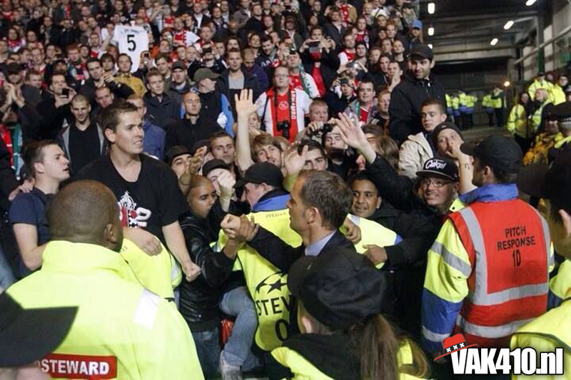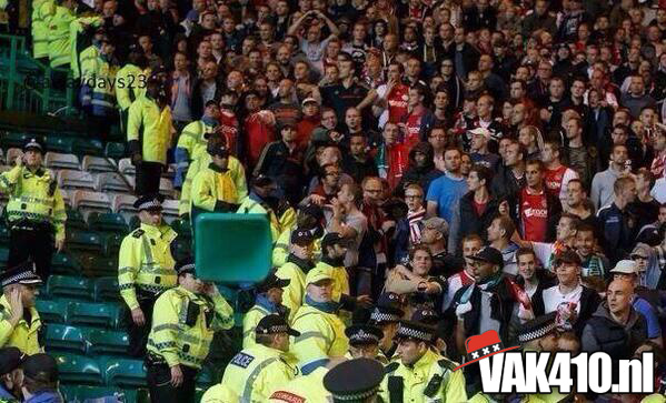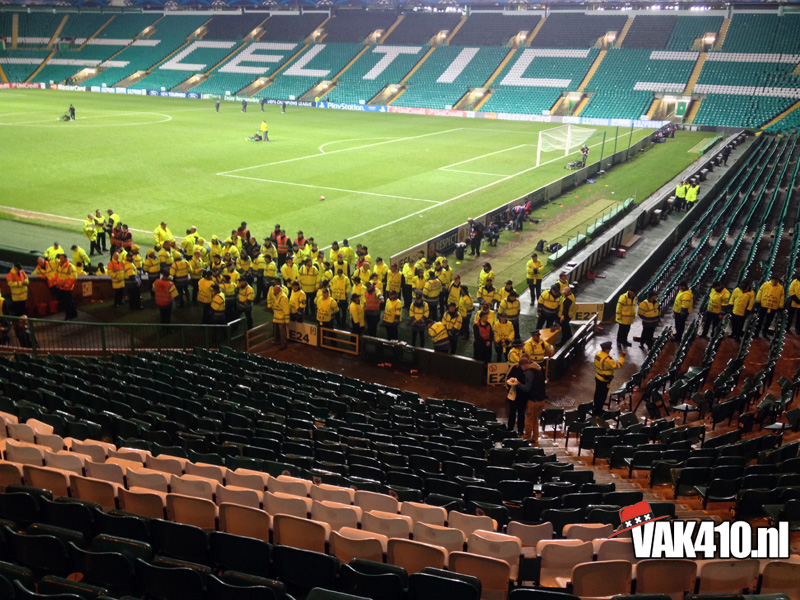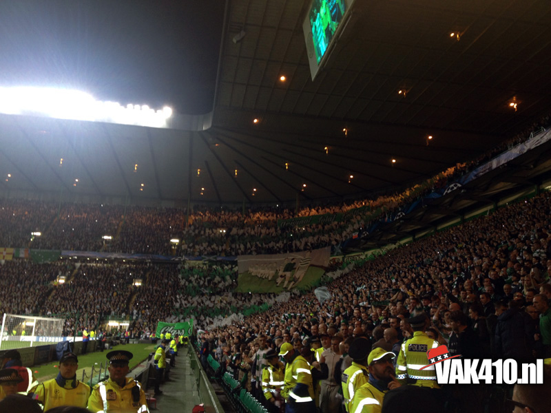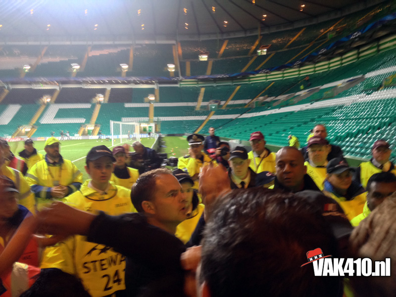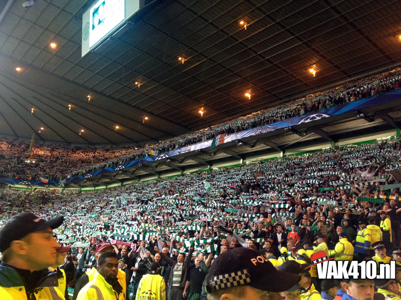 Voor de bekende Champions League hymne klonk het You'll Never Walk Alone. Werkelijk iedereen hield een sjaaltje omhoog en zong mee. Tijdens de wedstrijd was er ook een massale pogo te zien, dit was bijna te gek om waar te zijn, het hele stadion draaide de rug richting het veld. Dit was overigens als reactie op het uitvak wat knalde, vele malen werd het thuispubliek overstemd, zeker de gehele eerste helft. Vlak voor rust viel de 1-0 uit een penalty en werden de Schotse provocaties beantwoord met een regen van stoelen, munten en aanstekers. Waar de 1-1 had moeten vallen, viel na de rust de 2-0 en dan weet je dat het een heel lastig verhaal wordt. Desondanks kende het uitvak ook bij de achterstand een aantal goede piekmomenten. In de blessuretijd viel de aansluitingstreffer nog, maar dat mocht niet meer baten. Wel goed om van de Schotten zelf te horen dat er nog nooit zo'n hard uitvak is geweest op Celtic Park, een compliment om trots op te zijn. Amsterdam on top!