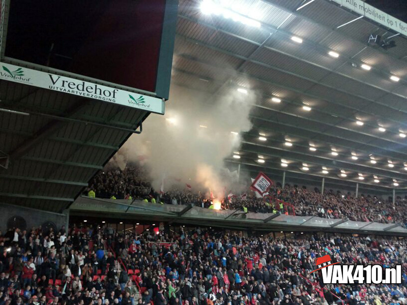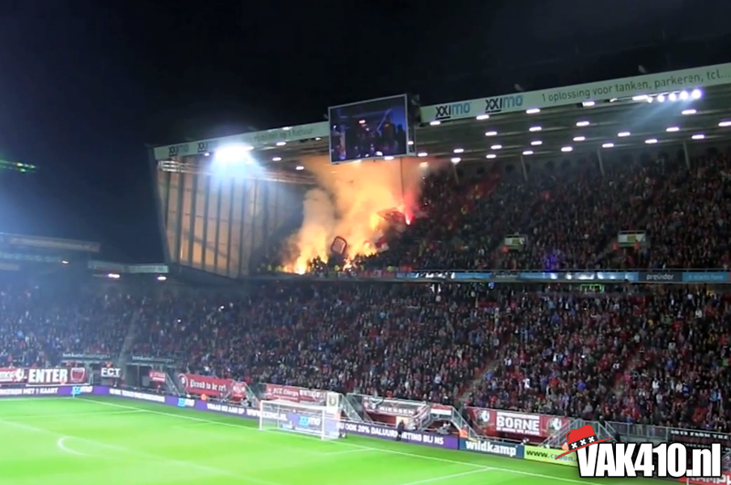 Bij aankomst in Enschede werden de drums en vele vlaggen direct over het uitvak verdeeld en de plaatsen ingenomen om meteen lekker op te warmen. Ook in het uitvak deden enkele nummers die uit de stadion speakers knalden het goed. Waar VAK P pas vlak voor de aftrap het vak opkomt was het het uitvak dat de lakens uitdeelde.