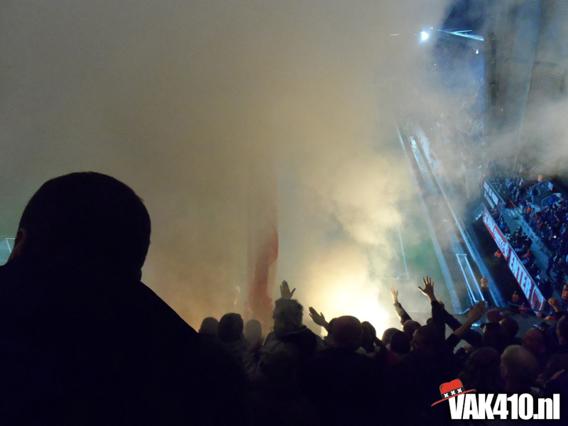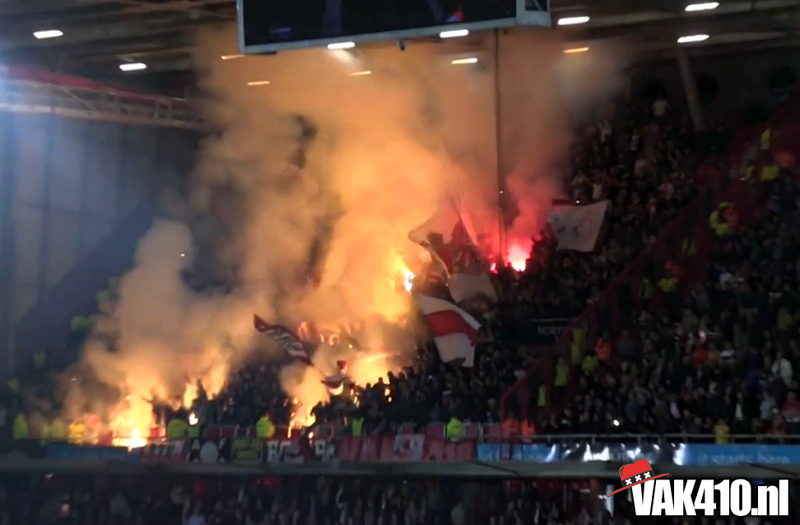 Bij opkomst van de spelers toonde VAK P een choreo van een niveau dat we niet gewend van ze zijn. Later bleek deze ook mislukt te zijn. Het uitvak eiste dan ook verreweg de meeste aandacht op. Verspreid over het vak vele vlaggen en een groot aantal mega vlaggen. Tegelijk werd er een pyro show van formaat weggegeven en de toon was meteen gezet. Helaas had dit weinig invloed op de 11 op het veld, want de 1e helft was om te janken.