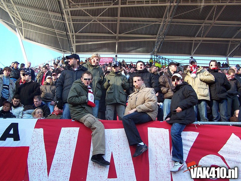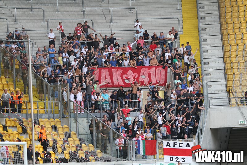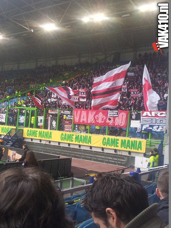 Vanaf nu heeft VAK410 dus een nieuw groepsdoek, de opvolger van het origineel maar exact hetzelfde. En om goed te beginnen zijn we met een groot deel van de groep met het nieuwe doek op de foto gegaan, voorafgaand aan de wedstrijd Ajax – Twente. Vanaf Vitesse uit zal het nieuwe groepsdoek dan ook overal met ons meereizen.