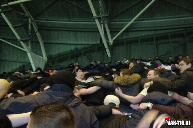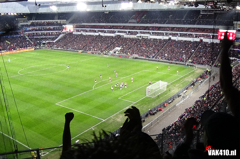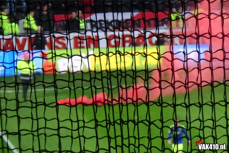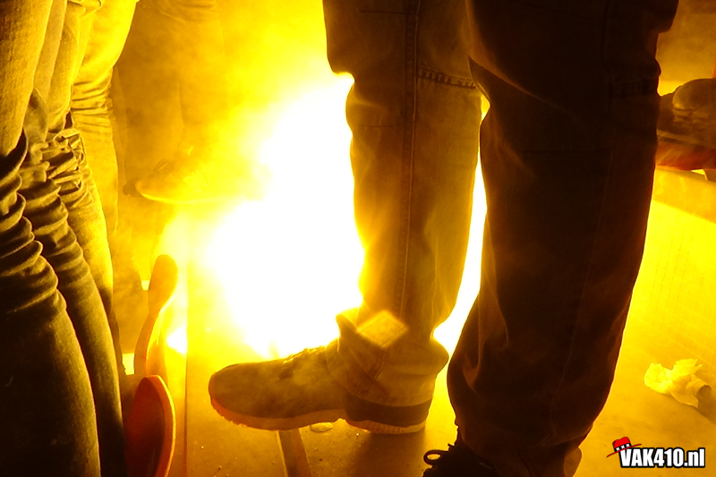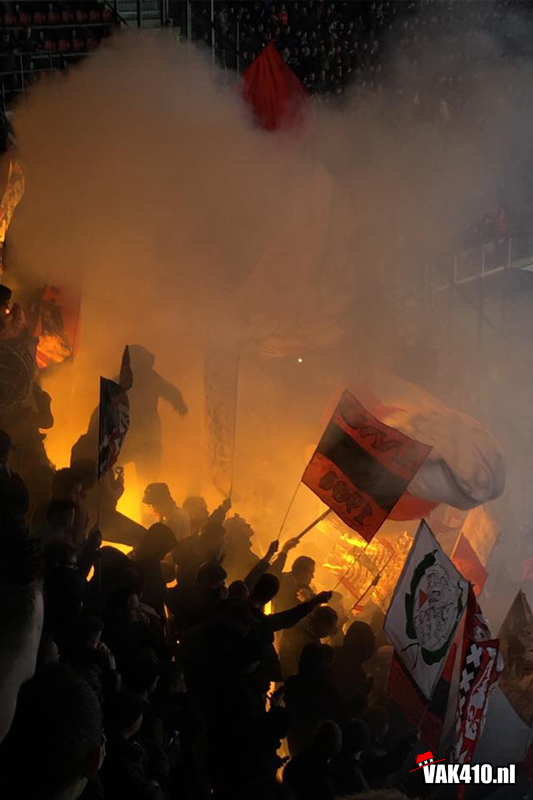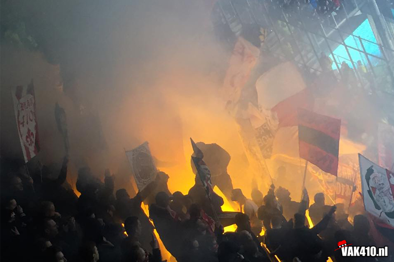 Een grote groep van VAK410 neemt vandaag wel plaats in het uitvak. Nadat diverse liederen zijn gezongen tijdens de warming up maken we ons klaar voor het begin van de wedstrijd. Bij opkomst van de spelers pakken we uit met een hoop bandieri's en vlaggen. De chaos wordt compleet met het nodige vuurwerk. Legalize pyro !