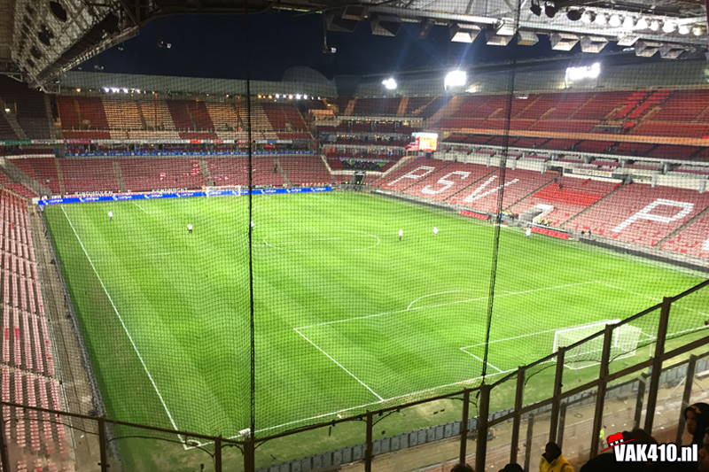 Zodra de rook is opgestegen galmen de songs vanuit het uitvak door het stadion. Gedurende heel de wedstrijd zijn we, ook op tv, luidkeels te horen. Af en toe is er een mooie battle op vocaal gebied met de PSV aanhang, maar over het algemeen zijn we op dit front vandaag de baas. Het volume ligt non-stop hoog en diverse songs zorgen voor een wild uitvak.