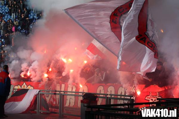 Vanmiddag heeft er een positief gesprek plaatsgevonden tussen een afvaardiging van VAK410 en Ajax. Enkele misverstanden over uitgedeelde stadionverboden zijn uit de wereld geholpen en er zijn duidelijke afspraken gemaakt om in de toekomst de relatie tussen ons en de afdeling veiligheid te verbeteren. Hierdoor zullen gevallen als deze in de toekomst hopelijk voorkomen kunnen worden. Daarom is er besloten er vanavond volle bak voor te gaan. Wat er zondag miste moeten we vanavond dubbel en dwars goed maken; 90 minuten kabaal, ook van alle critici die ons de afgelopen dagen verwijten hebben gemaakt. Cuenca was zondag al onder indruk van de sfeer in de arena, we zijn benieuwd naar zijn reacties na afloop van de wedstrijd van vanavond..