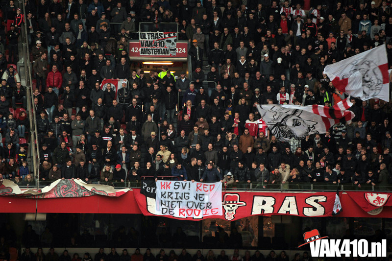 Toen werd er uit hogere hand besloten om op een andere manier roet in het eten te gooien. De smeris wees naar Ajax en Ajax wees terug, om vervolgens het weer te gooien op de, nog nooit vertoonde, milieupolitie. Conclusie, het uitdelen van flyers was per direct verboden. Niet op de Arena boulevard, niet binnen de poortjes en dat op straffe van €100 boete pp en in beslagname van de flyers. Weer een schoolvoorbeeld van supportertje pesten!