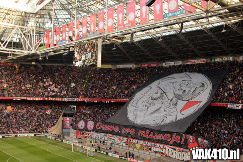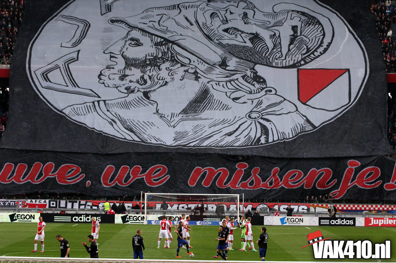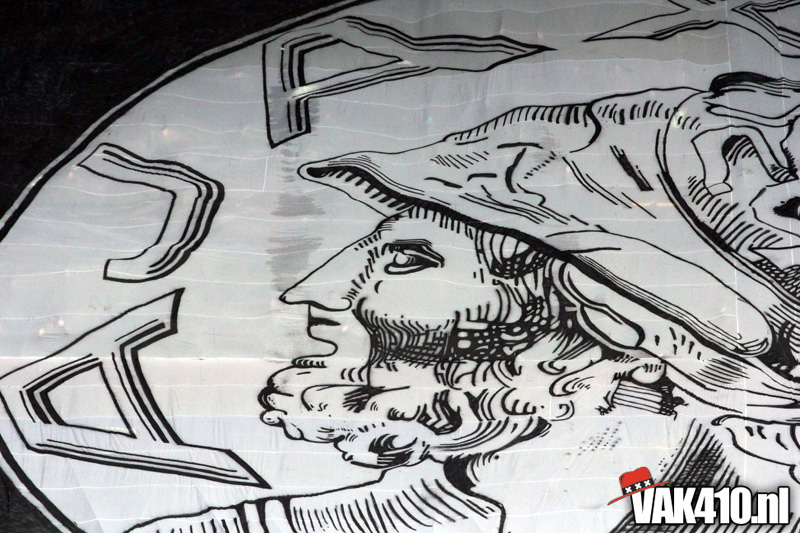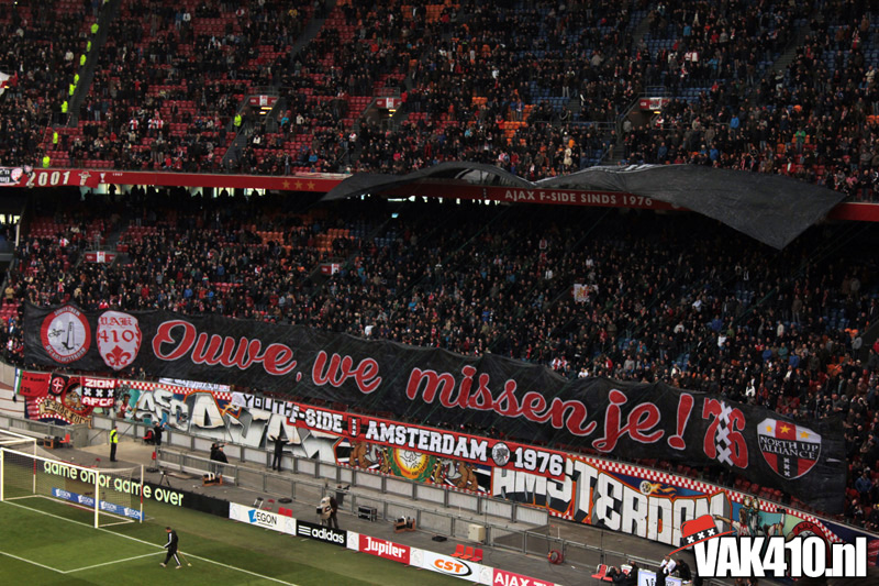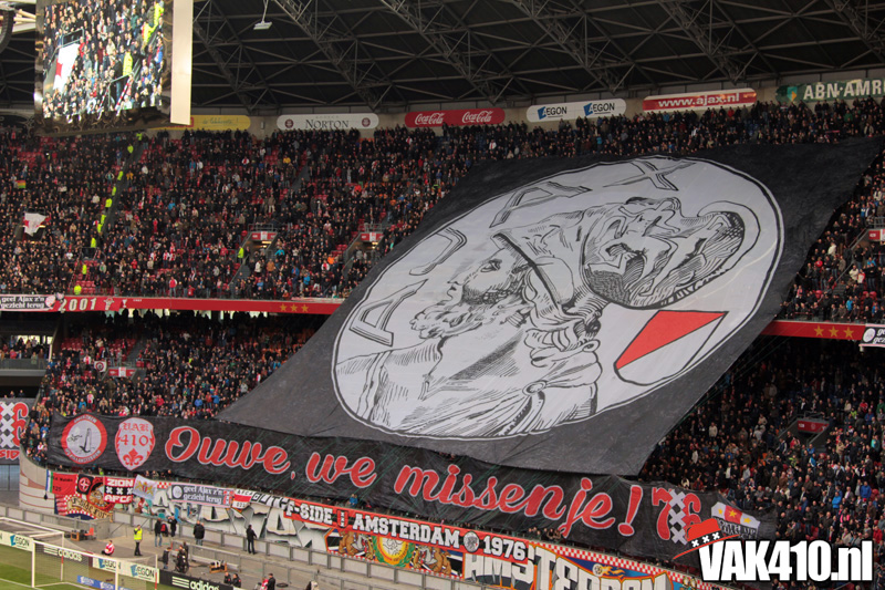 Voor de aftrap ontrolde op Zuid 1 & 2 in drie delen een gigantische Tifo actie. Het oude en enige echte Ajax logo werd begeleid met de tekst: “Ouwe, we missen je!”. Naast de tekst waren de logo’s te zien van VAK410, de F-Side, South Crew en de NUA. Na de publiciteit vanaf woensdag kon heel Nederland het zien. Wij willen ons oude logo terug; Geef Ajax z’n gezicht terug!