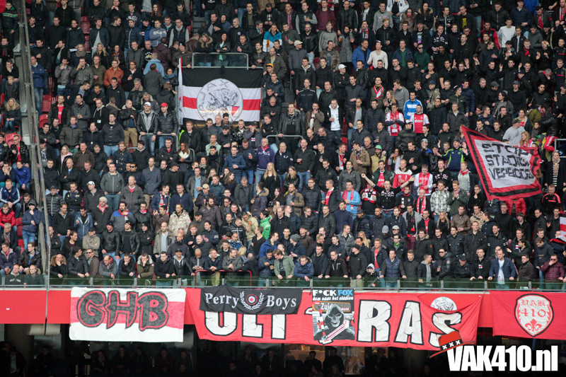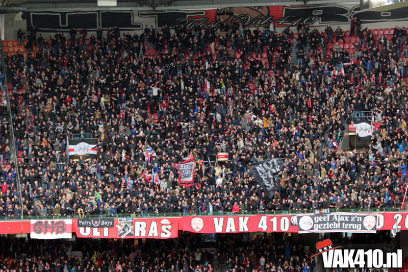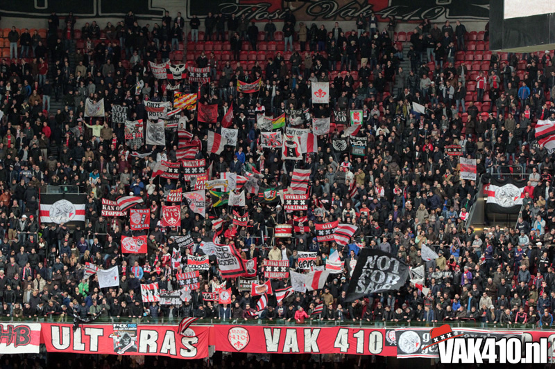 Bij aftrap kleuren vlaggen en bandieri's ons vak. Op noord laat North Up Alliance zich vandaag zien in de campagne voor de terugkeer van het oude logo! Tezamen met alle supportersgroepen zullen we deze strijd niet snel opgeven. Op VAK410 uiteraard ook weer vele uitingen waaruit blijkt dat het oude logo leeft onder onze supporters; megavlaggen, bandieri's, nieuwe doekjes bij de vakopgangen, onze trainingsjacks en nog veel meer shirtjes en andere merchandise.